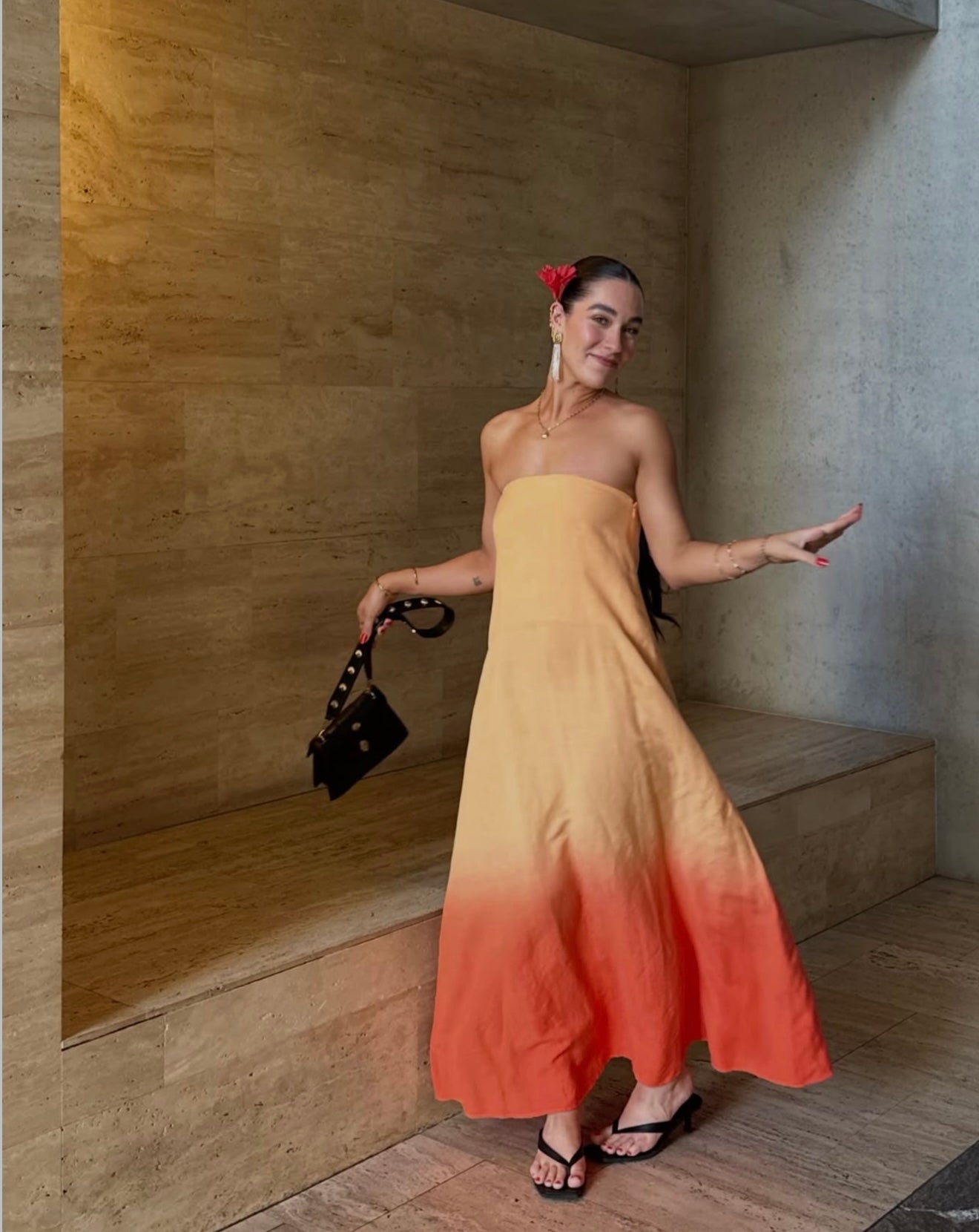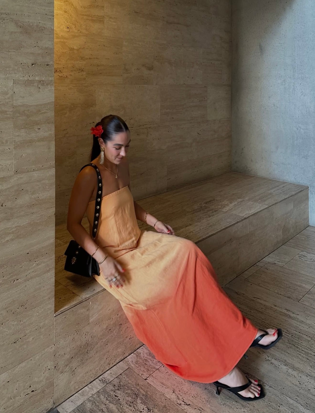 The Gina Dress in Mello glows like a summer sunset. With its dip-dyed golden gradient, no two pieces are the same. The strapless silhouette and flowing tiered skirt make this dress a radiant show-stopper that’s as comfortable as it is striking.